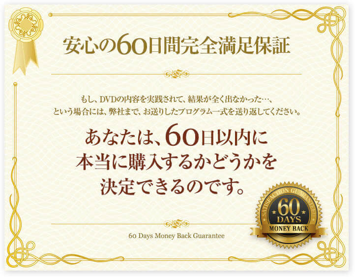 もし、DVDを購入して頂き、今よりも技術的なスキルが上がらない、或は実践したにも関わらず効果がみられないということであれば、弊社商品配送日から60日以内(必着)であれば、全額返金します。
