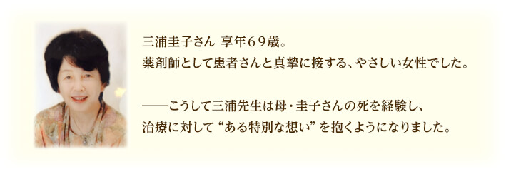 三浦は母を毎週診ていたが、母は原因がはっきりしない痛みを訴え続け、遂には満足のいく根本治療を施せぬまま、他界する。