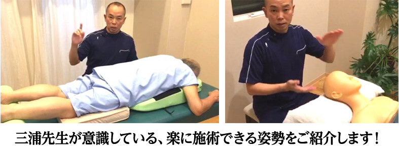 そんな先生のために、患者さん・施術者ともにリラックスして施術をすることができる施術時の姿勢を三浦先生が紹介してくださいます。