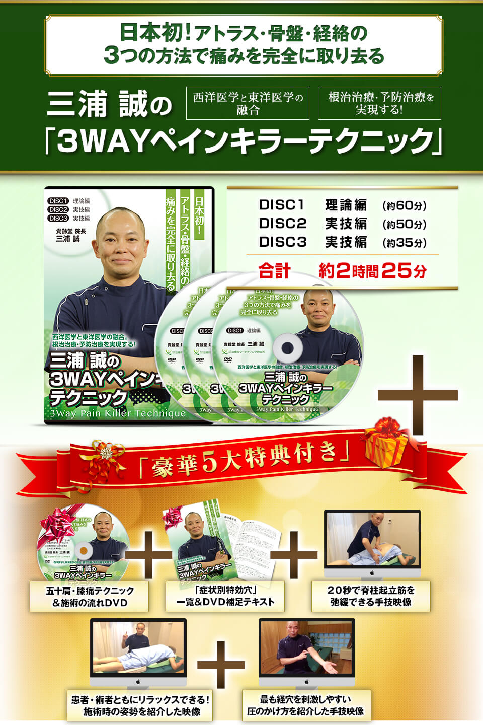 今回発表した「3WAYペインキラーテクニック」DVDは、世界で初めてカイロプラクティックと鍼灸治療というまったく異なる2つの治療法を融合させた、唯一のDVDです。