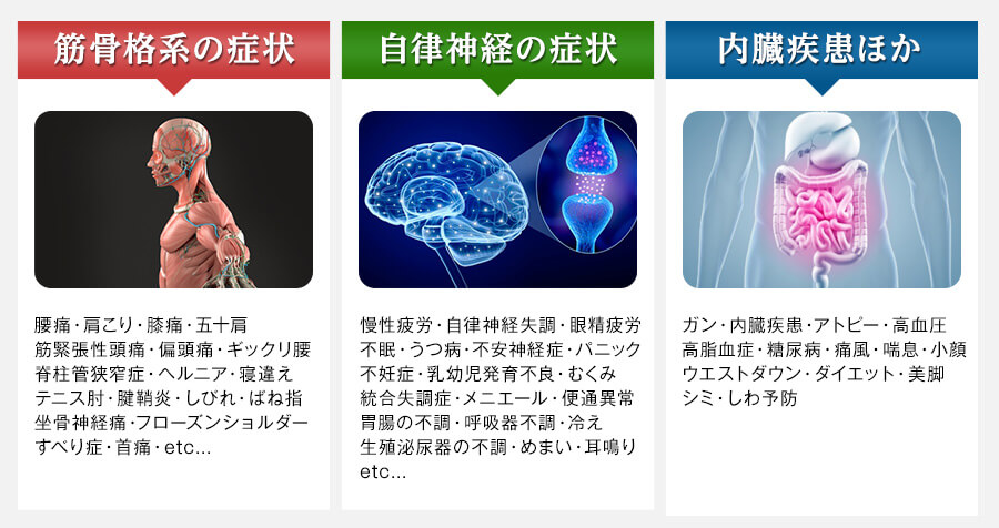 難治性の腰痛、ギックリ腰、ひざ痛、慢性疲労、不眠、坐骨神経痛、肩こり、五十肩、椎間板ヘルニア、股関節痛、ヘルニア、不妊症、アトピー、腱鞘炎…